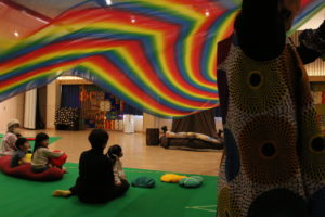 ハサミや糊などは一切使わず、びりびり・ぐしゃぐしゃ・ぺたぺたしながら、アフリカのリズムに身を委ねて、作品を創ります。